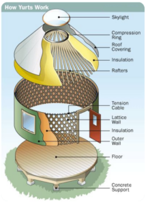 A yurt is a remarkable circular tent-like dwelling. Traditionally, they are constructed with a wooden lattice frame covered with durable fabric and are topped with a dome.