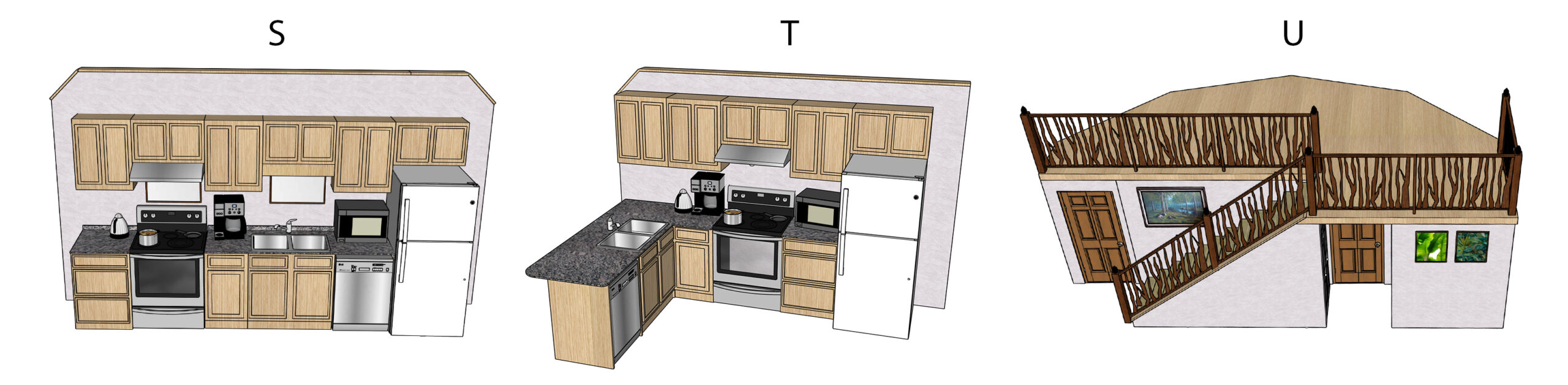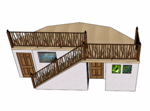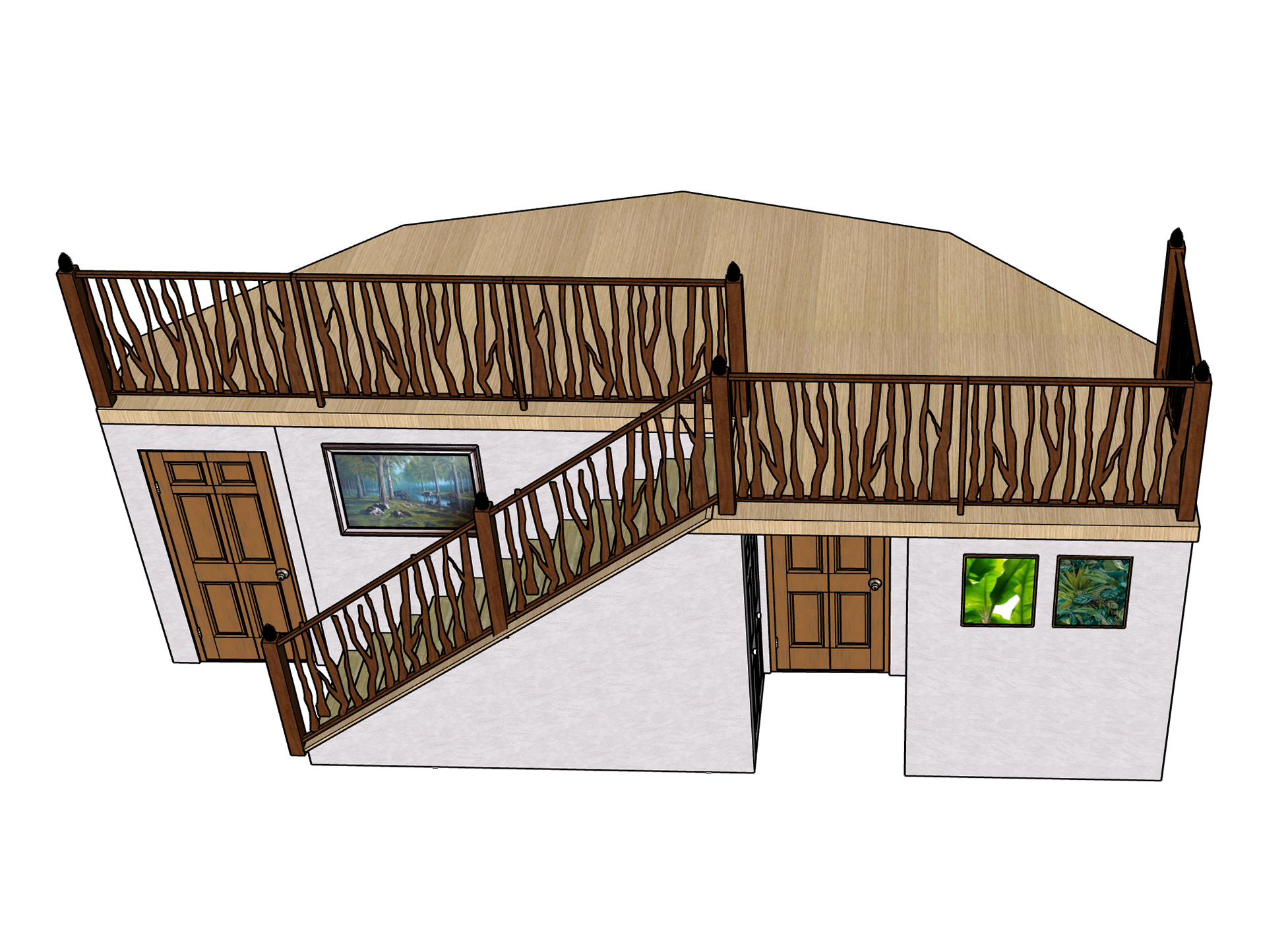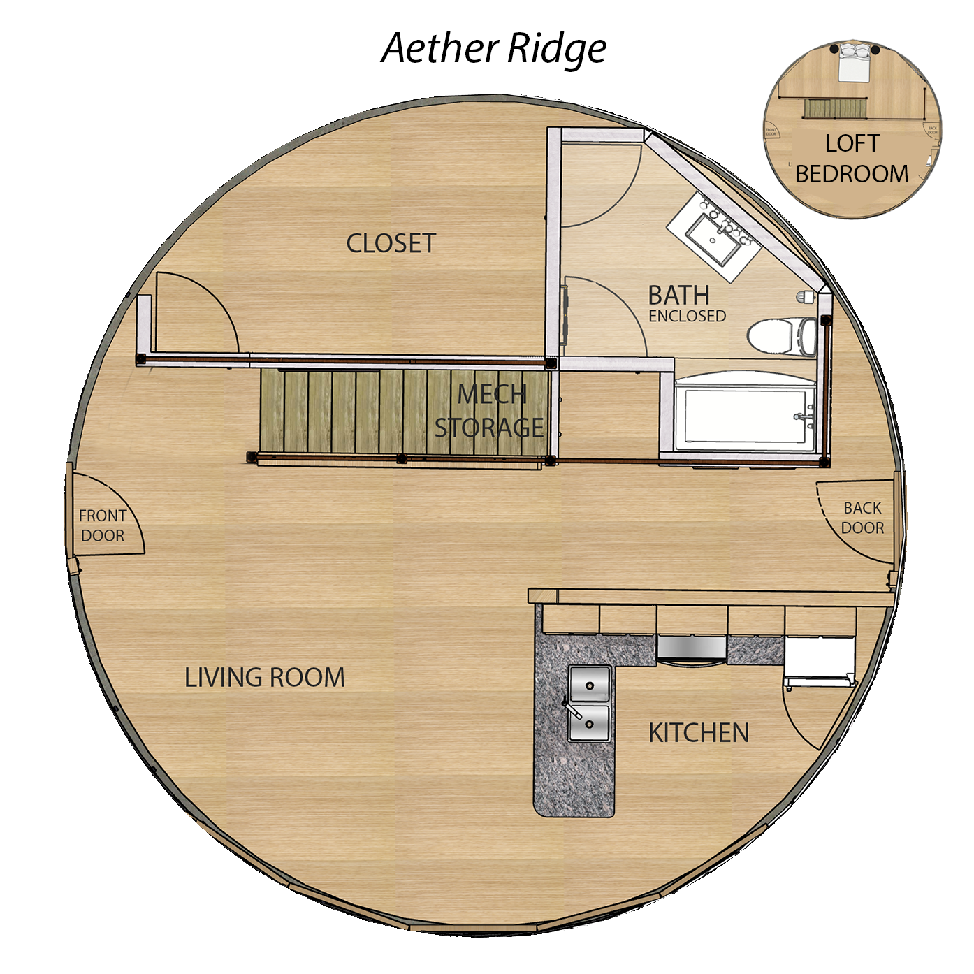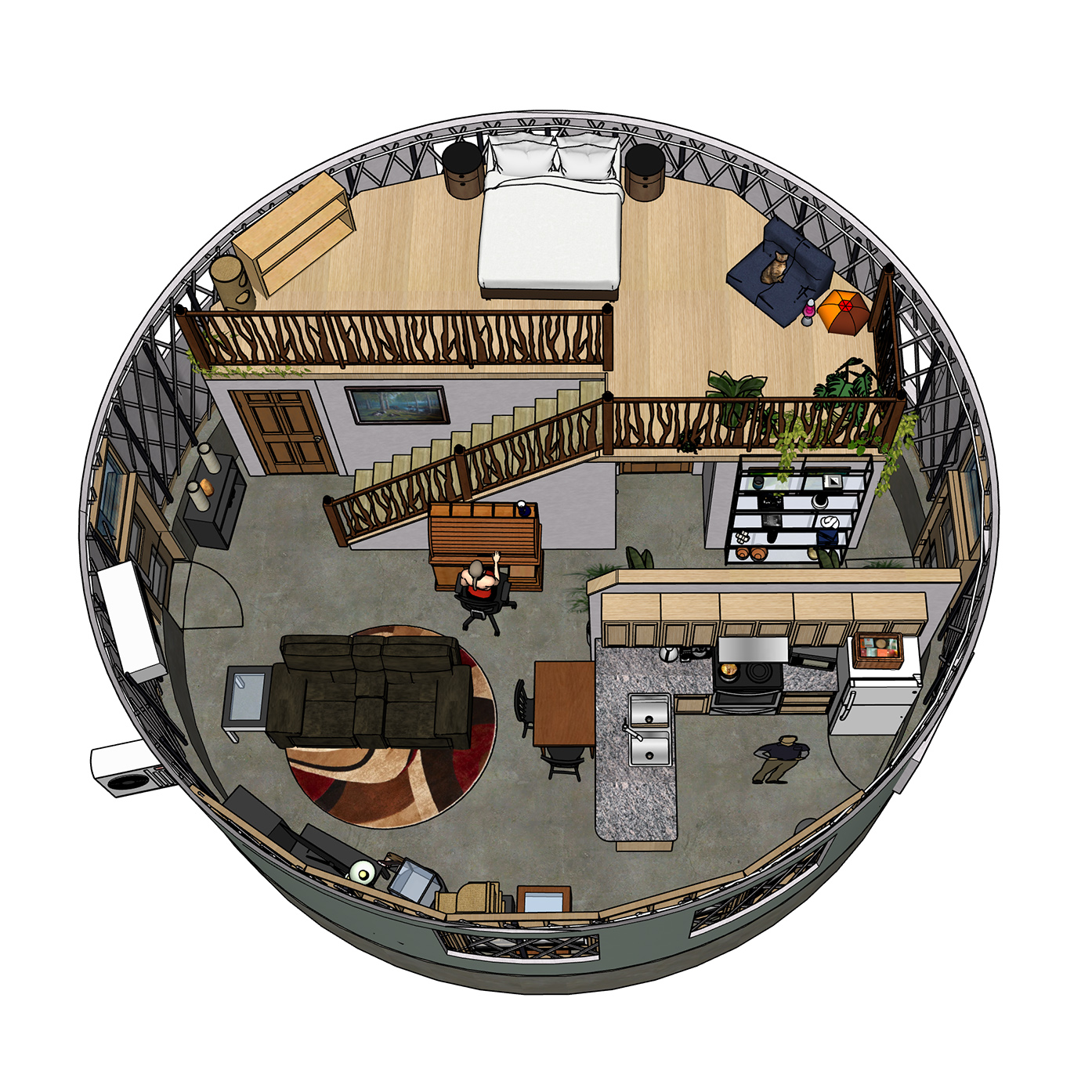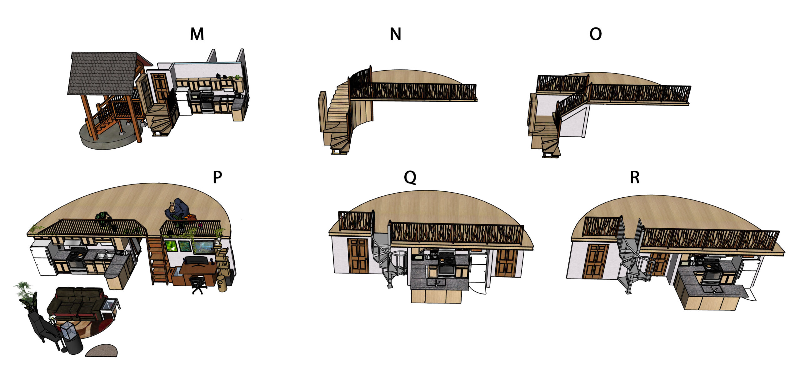 - Loft Bedroom: Polygonal half-circle freestanding structure, doubles as ceiling for below enclosed area/bath.